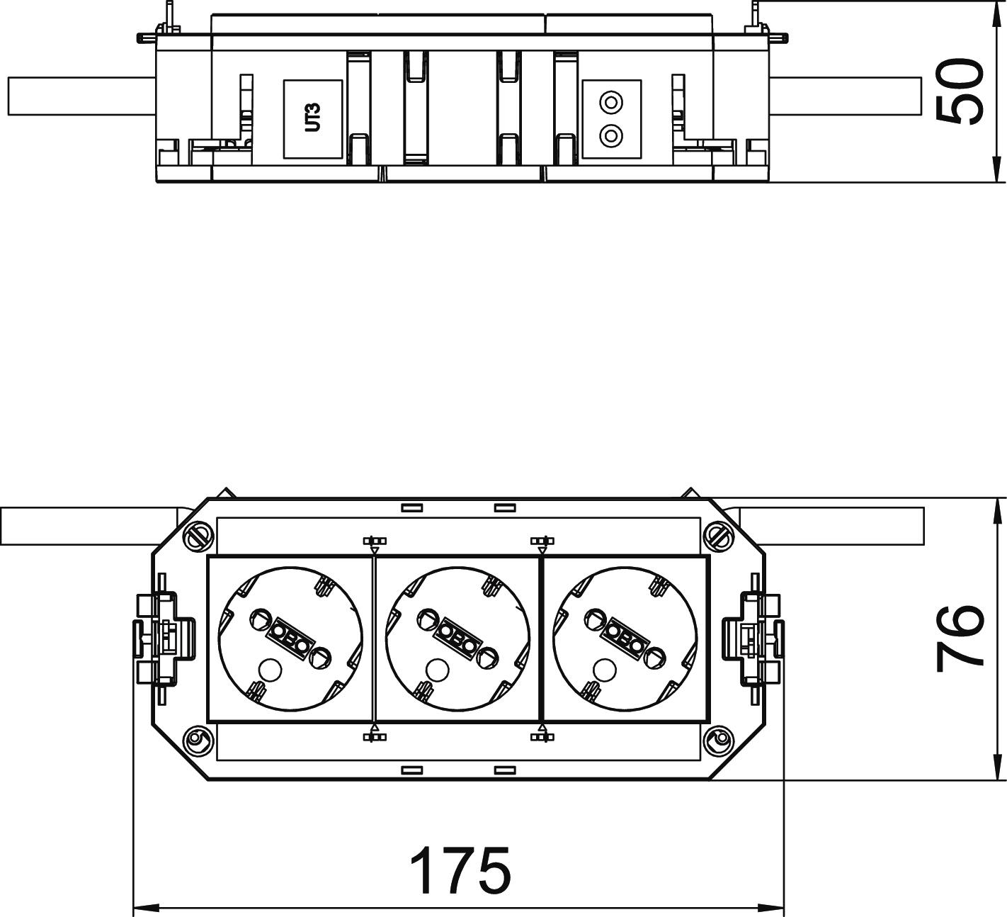 Propojený univerzální nosič UTC3 disponuje 2 bílými předinstalovanými zásuvkami s ochranným kontaktem 33° pro proud 16 A a jednou oranžovou předinstalovanou zásuvkou s ochranným kontaktem 33° pro proud 16 A.