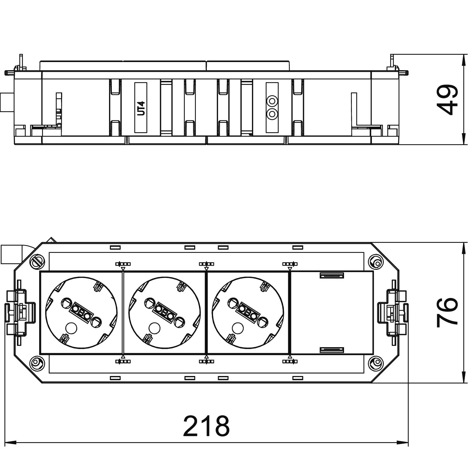 Propojený univerzální nosič UTC4 disponuje 3 bílými předinstalovanými zásuvkami s ochranným kontaktem 33° a zaslepovacím krytem pro dodatečnou vestavbu instalačního přístroje řady Modul 45.